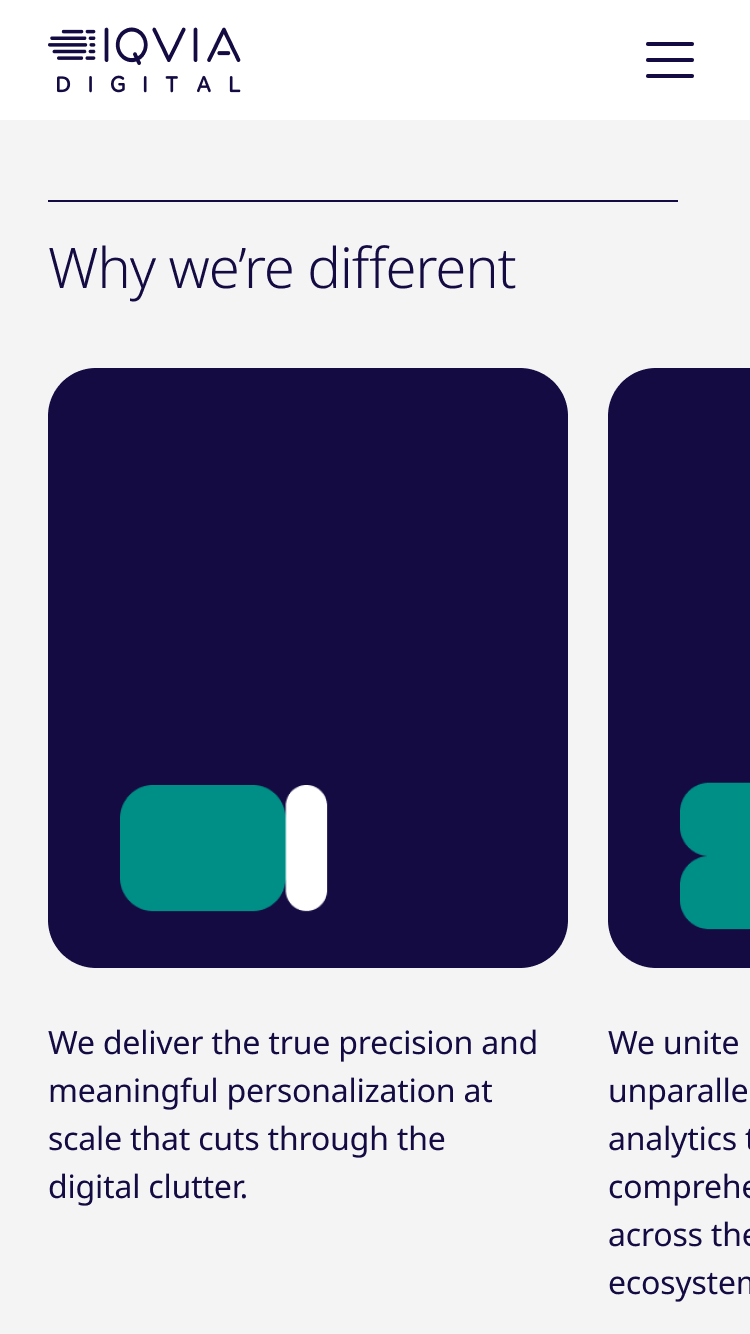 For the design of the new website, I created a detailed design system in collaboration with Interbrand, responsible for the branding of IQVIA Digital. Based on the new visual identity, I explored a clean and minimal look&feel, a set of dynamic components and an interactive digital experience.
